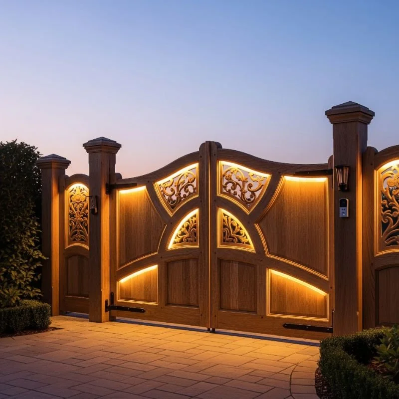 Extend your wooden gate's impact beyond daylight hours through integrated lighting systems that transform functional entrances into dramatic evening focal points. This sophisticated approach incorporates carefully positioned fixtures—recessed LED strips along structural elements, downlighting from overhead components, or strategic spotlighting—that highlight architectural details while providing practical illumination for arrival and security. Implement using low-voltage systems with discreet wiring channels routed into wooden components before assembly, connecting to photocell or smart home controls that ensure automatic operation without daily management. For subtle sophistication, choose warm-temperature lighting (2700-3000K) that enhances wood's natural warmth rather than cool LEDs that create harsh, unnatural appearances. This enhancement transforms ordinary gates into round-the-clock architectural statements while providing practical benefits through improved visibility, security, and nighttime curb appeal. The illuminated presence creates particularly strong visual impact against dark backgrounds, making these gates especially effective for rural properties or homes set back from street lighting. Like theatrical lighting that transforms simple stage sets into immersive environments, these illuminated entrances create dramatic property introductions long after the sun sets.