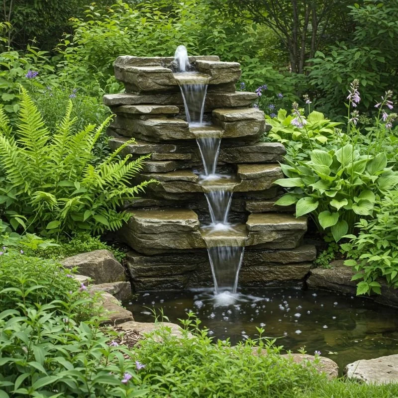 11. Cascading Rock Fountain with Lush Greenery